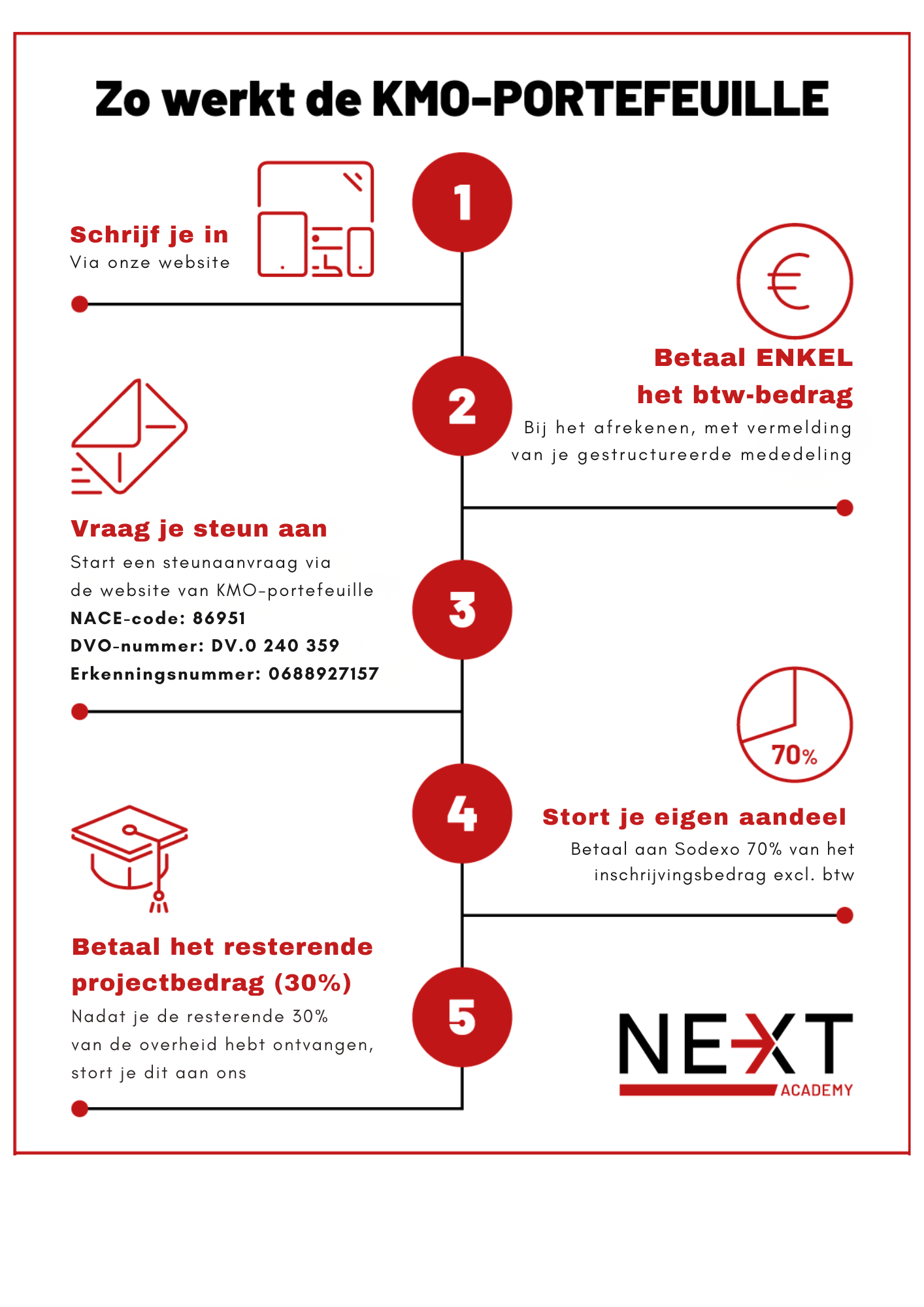 Wanneer de opleiding waarvoor je je wil inschrijven in aanmerking komt voor de KMO-portefeuille, kan je dit aanvinken op de opleidingspagina. Wanneer je dit aanvinkt, zal enkel het btw-bedrag (21%) meteen aangerekend worden. Je bent zelf verantwoordelijk om onderstaande stappen binnen het systeem van de KMO-portefeuille tijdig in orde te maken & op te volgen.